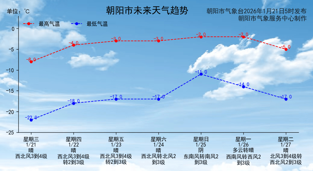 今天5时朝阳市区天气实况:晴间多云,西北风1.9m/s,气温-23.6℃。