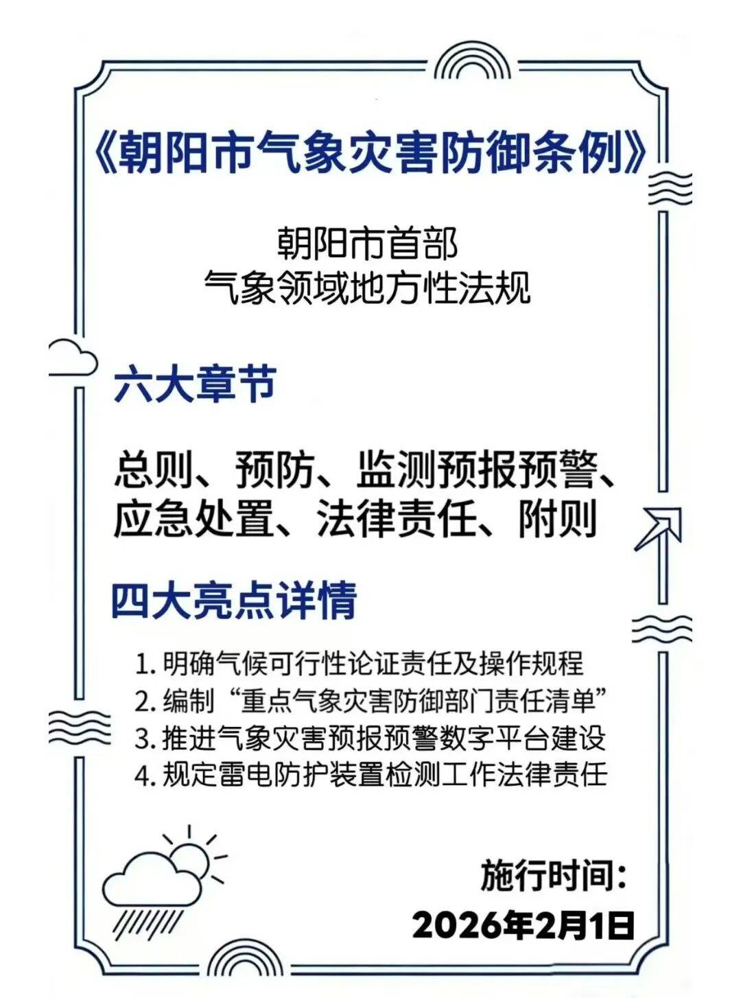 朝阳市气象灾害防御条例作为朝阳市出台的首部气象领域地方性法规,将于2026年2月1日起施行,这对加强气象灾害监测预警,完善农业气象服务体系,依法依规推进现代化农业强市建设具有十分重要的意义。