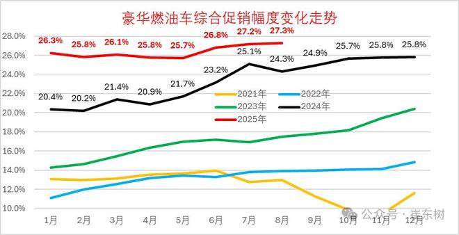 崔东树指出,虽然消费升级推动高端需求较强,但由于新能源的分流,2024年4-8月豪华车促销力度持续增大到25.1%,2025年1月处于历史新高水平。随着减产稳价,2025年2-5月促销力度高位回落,6-8月促销加大。